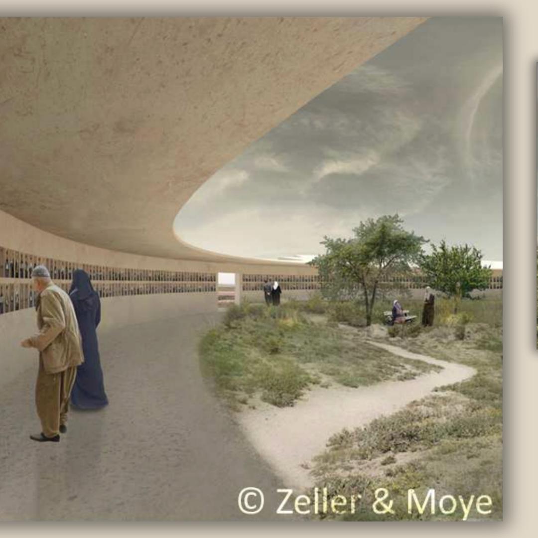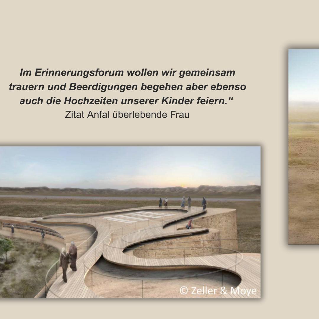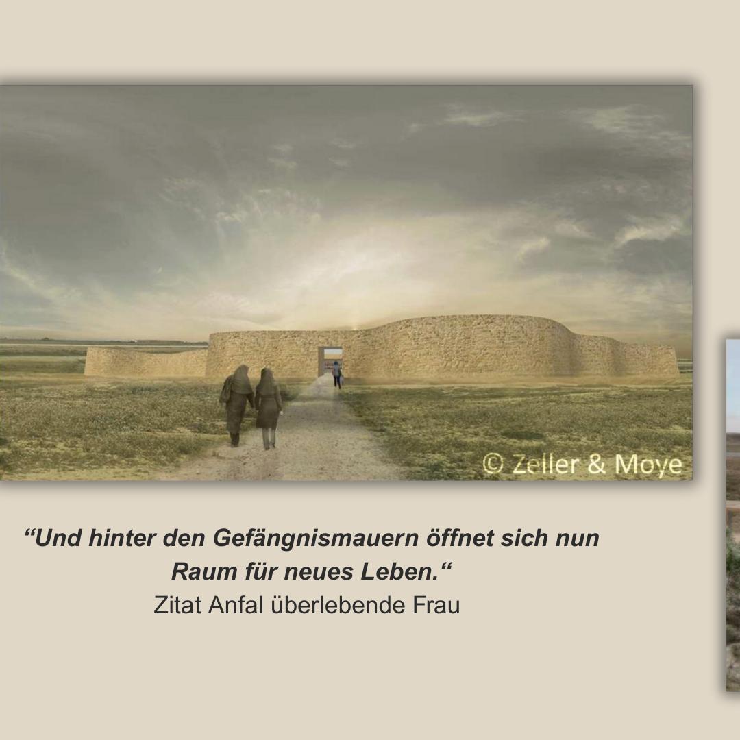 After intensive discussions, the design by the German architectural firm Zeller & Moye was accepted by all parties involved in 2013. The perspectives of the survivors, their memorabilia and their ideas shaped the building design and made a participatory ‘commemoration from below’ visible. The design takes into account the wishes of the Anfal women survivors, integrates meeting, exhibition and relaxation rooms into a protective outer wall, and combines traditional materials with modern design language. In this way, the building blends into the landscape of Germian while remaining visible.